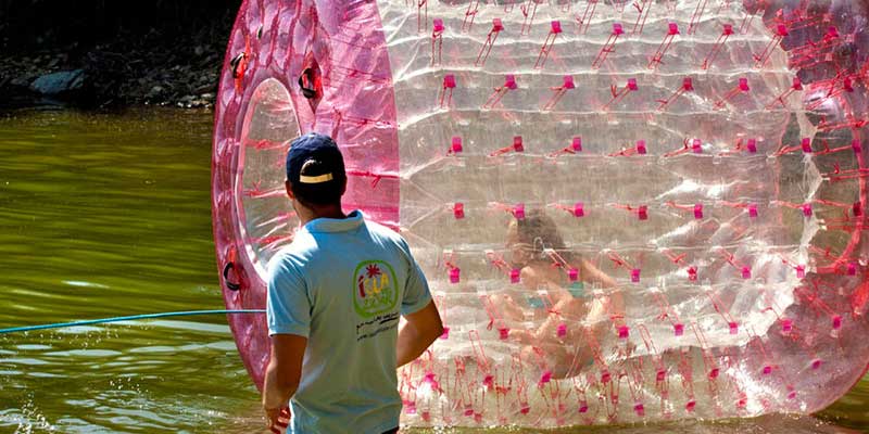 Disfruta del sol y el agua con las emocionantes atracciones acuáticas: Pasarela, tobogán, bolas, rodillos, banana.